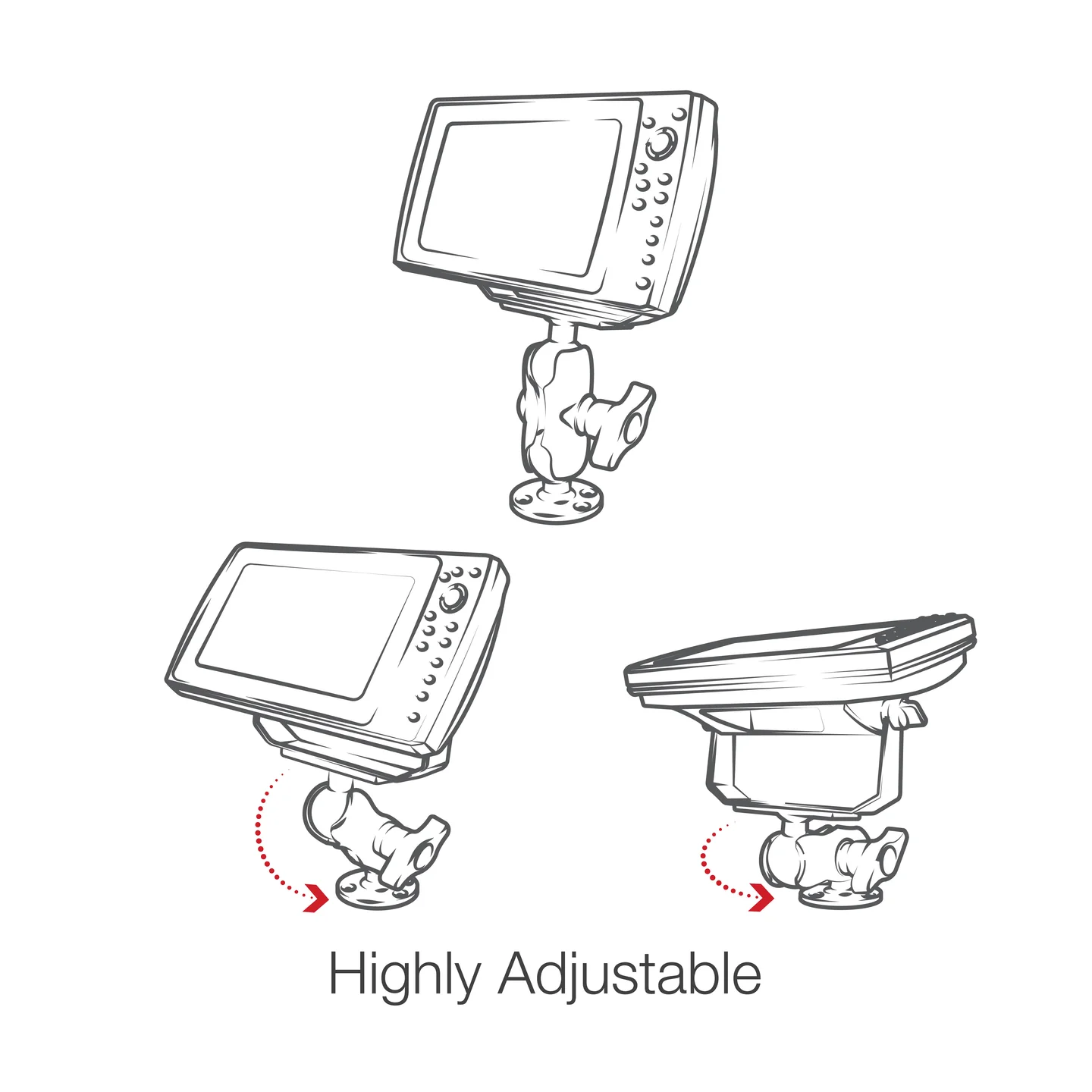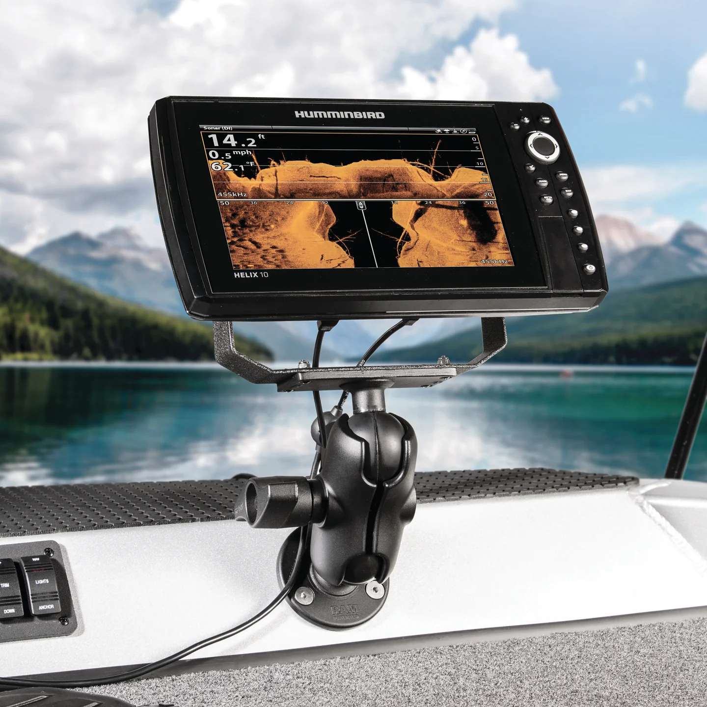 Stiprinājums paredzēts: Aksesuāriem vai eholotēm, maksimāli pieļaujamais eholotes izmērs 14″ collas.